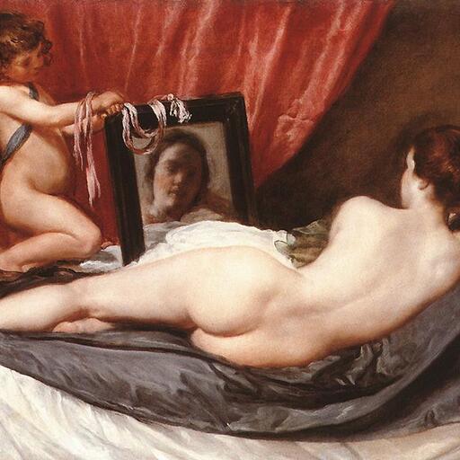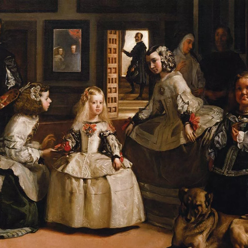 Las Meninas was painted in 1656 and depicts a room in the Royal Alcázar of Madrid. In this room appears the Infanta Margarita Teresa of Austria (1651-1673), daughter of Philip IV of Spain and Mariana of Austria. She is the central figure and is surrounded by her entourage and Velázquez himself, painting on the large canvas. According to the treatise writer Antonio Palomino in his analysis of this painting (1724), the main characters accompanying the daughter of the kings are palace servants.Beside the Infanta are Doña María Agustina Sarmiento, on the left, and Doña Isabel de Velasco, on the right. They are the queen's two ladies-in-waiting. We also see the painter Velázquez himself working before a large canvas; the dwarf lady-in-waiting Mari Bárbola and the palace servant Nicolasito Pertusato, with a mastiff; behind them, the lady-in-waiting Doña Marcela de Ulloa, next to a chamberlain; and, in the background, through the door, José Nieto, the chamberlain, appears. In the background, there is a decorative element, a mirror, reflecting the image of King Philip IV and Queen Mariana of Austria, the Infanta's parents, suggesting that they are outside the painting and appearing as mere spectators. The presence of the painter within the painting itself, as well as the monarchs in the background, breaks with the traditional conventions of portraiture and adds a meta-referential dimension to the work.
